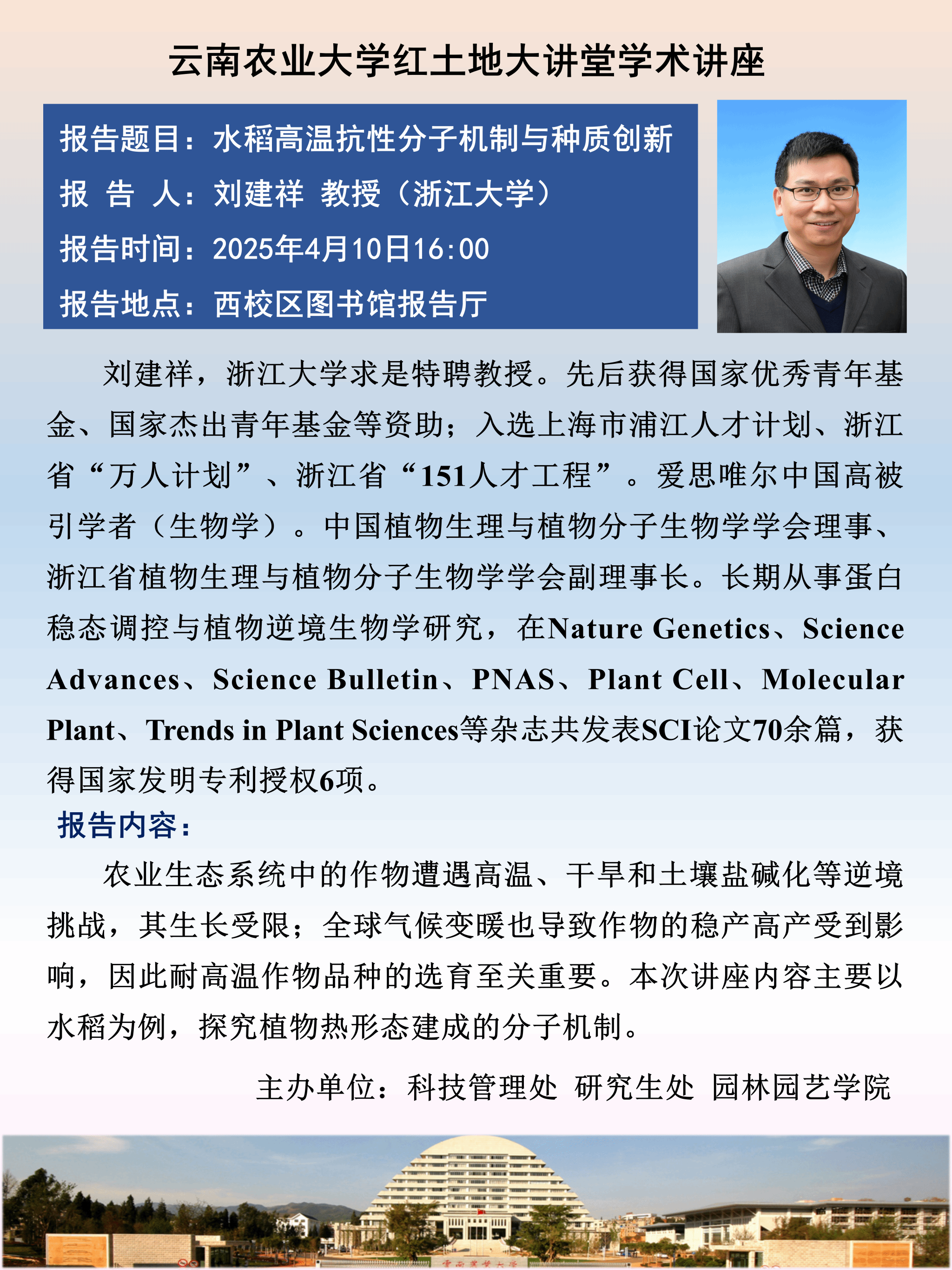 4月10日“红土地”大讲堂:水稻高温抗性分子机制与种质创新