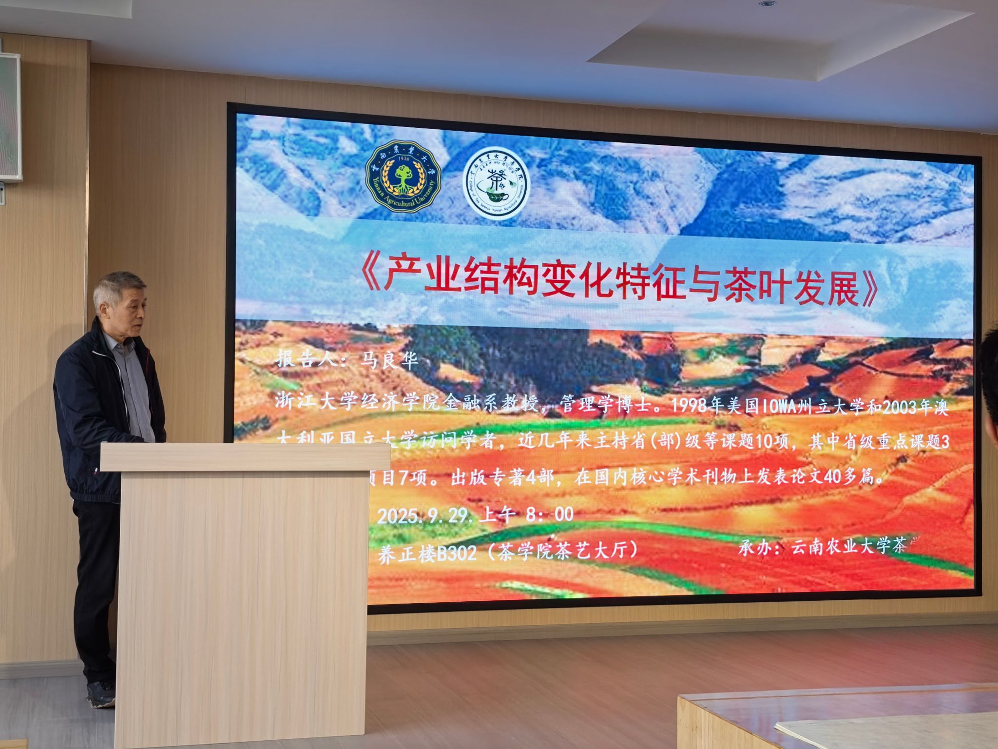 讲座中,马良华教授以全球产业结构变迁为切入点,结合数据与典型案例,梳理了我国产业升级的总体趋势与核心特征。随后,他将研究视角聚焦于云南茶产业,围绕“产业结构转换特征”“茶产业发展现状”“产业升级痛点与机遇”三大核心展开解读,既剖析了茶产业在消费升级、技术变革背景下面临的挑战,也指明了其转型发展的潜在空间。
