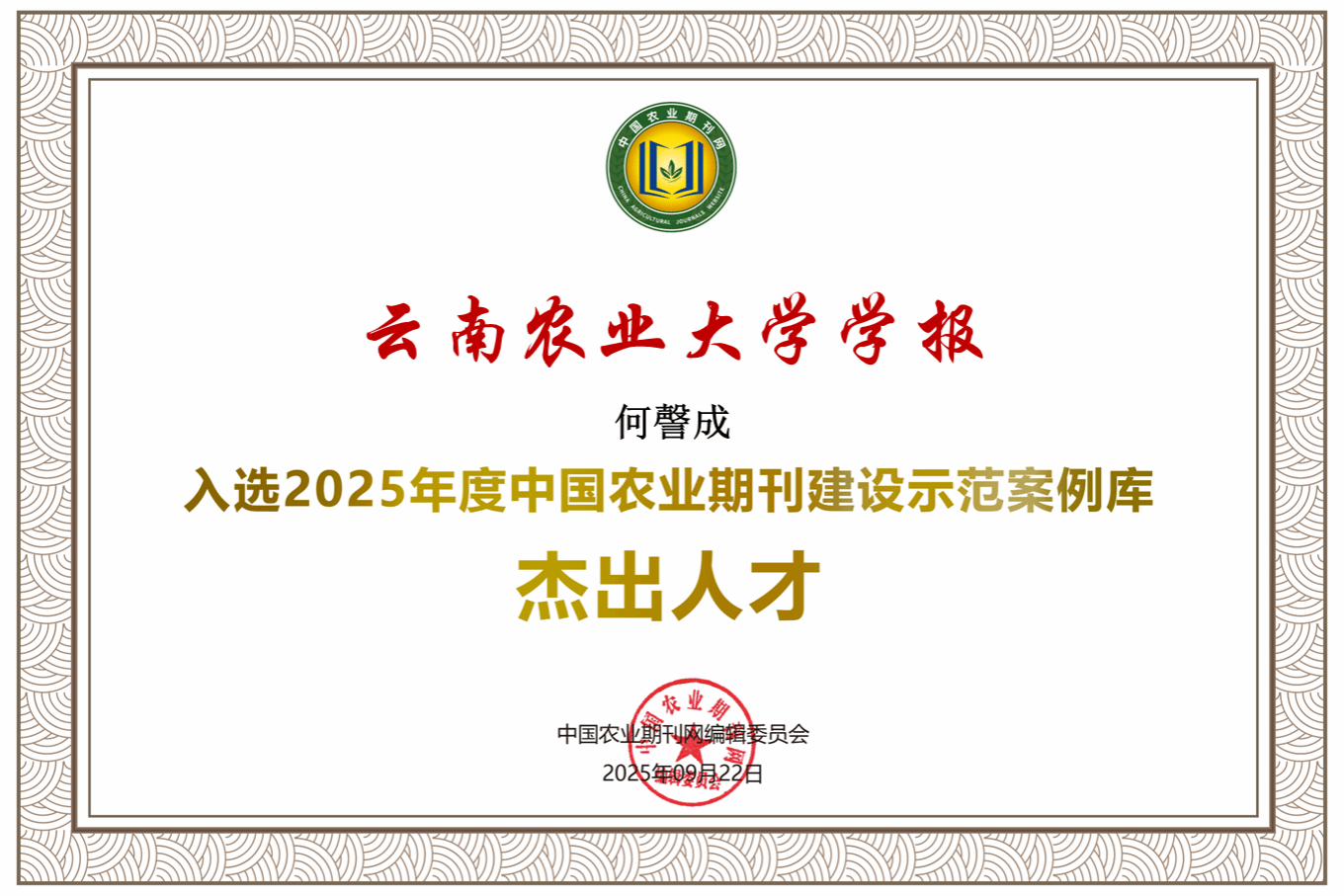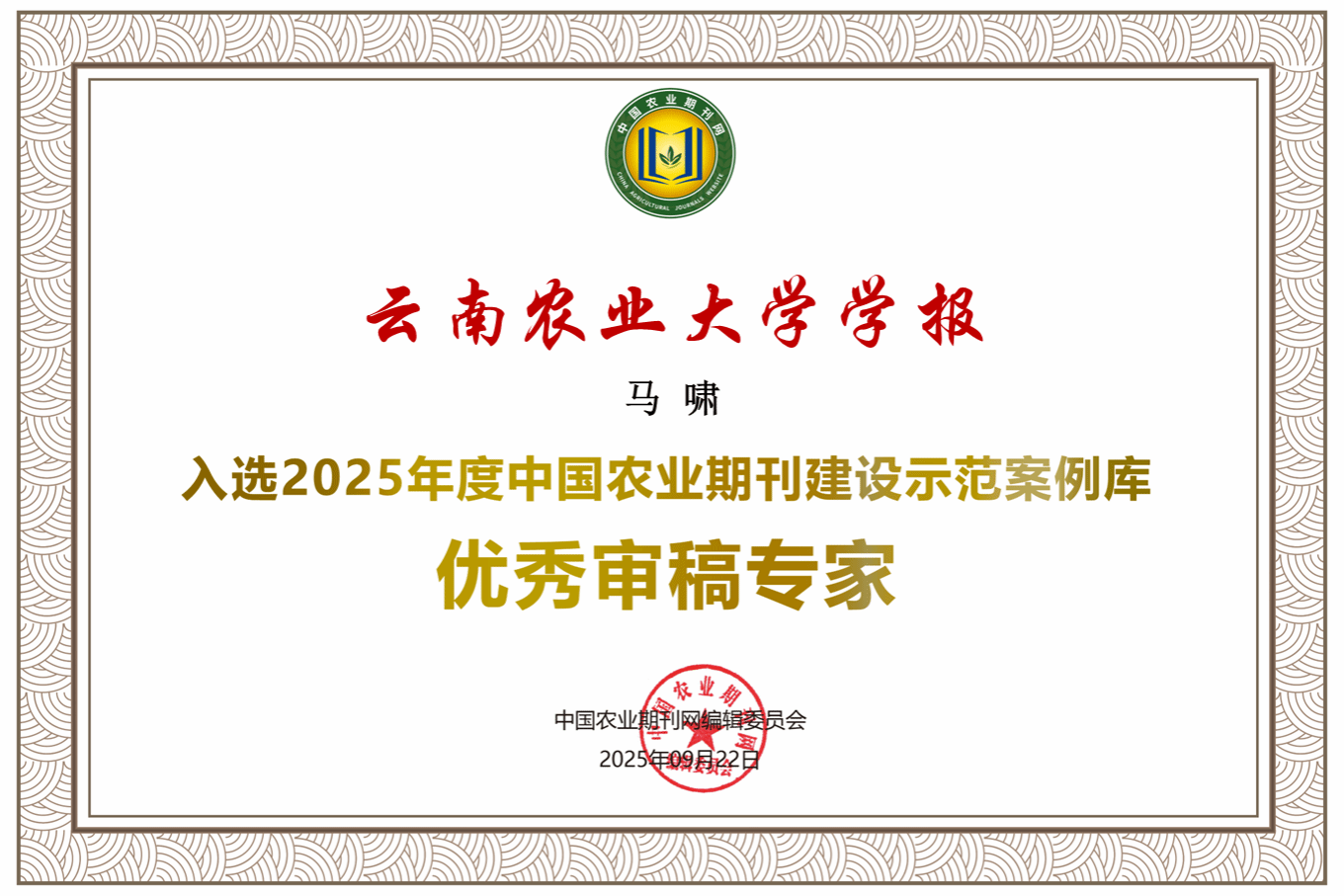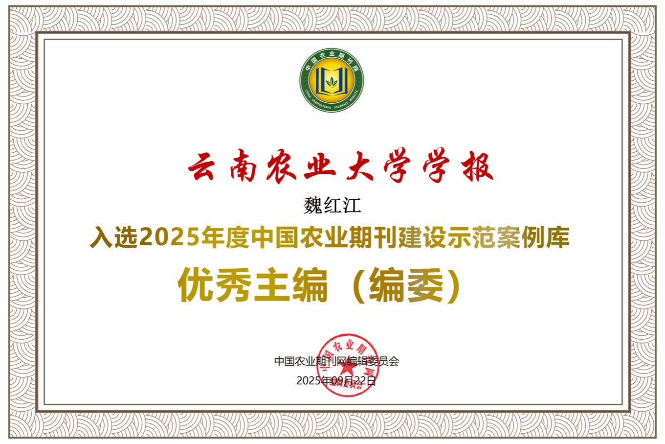 《ac米兰官网中文网站学报》编辑部荣获“2025年度中国农业期刊建设示范案例库优秀团队”。学校魏红江教授和马啸教授分别被评为“2025年度中国农业期刊建设示范案例库优秀编委”和“优秀审稿专家”。编辑部何謦成副编审被评为“2025年度中国农业期刊建设示范案例库杰出人才”。刊载论文《高山附子根际功能微生物的筛选鉴定及其生物学活性》被评为“2025年度中国农业期刊建设示范案例库优秀论文”。